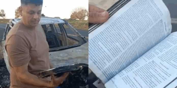 Emocionado, ele declarou: “O carro pegou fogo… não sobrou praticamente nada. Mas sobrou uma coisa dentro do carro: a palavra do Senhor está intacta, para a honra e glória dele”.