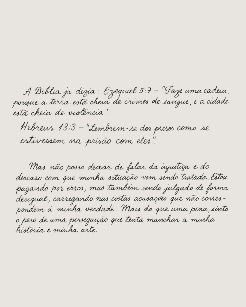 “Estou pagando por erros, mas também sendo julgado de forma desigual, carregando acusações que não correspondem à minha verdade. Mais do que uma pena, sinto o peso de uma perseguição que tenta manchar minha história e minha arte.”
