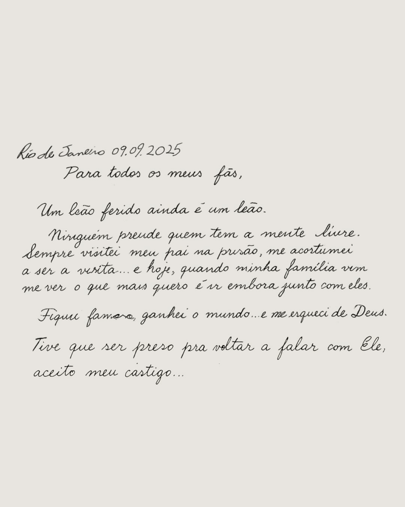 “Um leão ferido ainda é um leão. Ninguém prende quem tem a mente livre”, escreveu o cantor, que disse ter se acostumado a visitar o pai na prisão e agora sente a dor de ser visitado pela própria família.