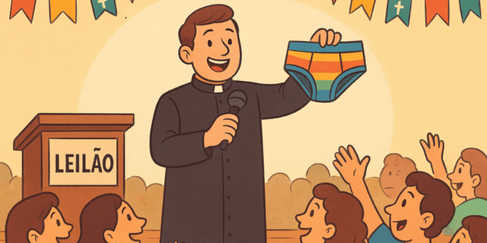 O vídeo, gravado no dia 28 de setembro, mostra o momento em que o sacerdote sobe em uma cadeira, puxa discretamente o cós da roupa íntima e faz uma pequena dancinha, enquanto o leiloeiro conduz a brincadeira com o público. “Dois mil na cueca do padre. Parou? Vou vender por R$ 2 mil. R$ 3 mil aqui. Vou vender por três mil”, anuncia o leiloeiro, arrancando gargalhadas.